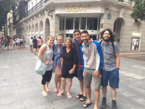 in front of the Gugenheim Museum at 6 pm. We met there with Carol, Claudio, Lorenzo, Petra and Maja (the mother and daughter from Germany), and Bennie (also from Germany). Everyone who had walked into town through Lezama applauded our wise bus riding decision! Here’s us a bit later.