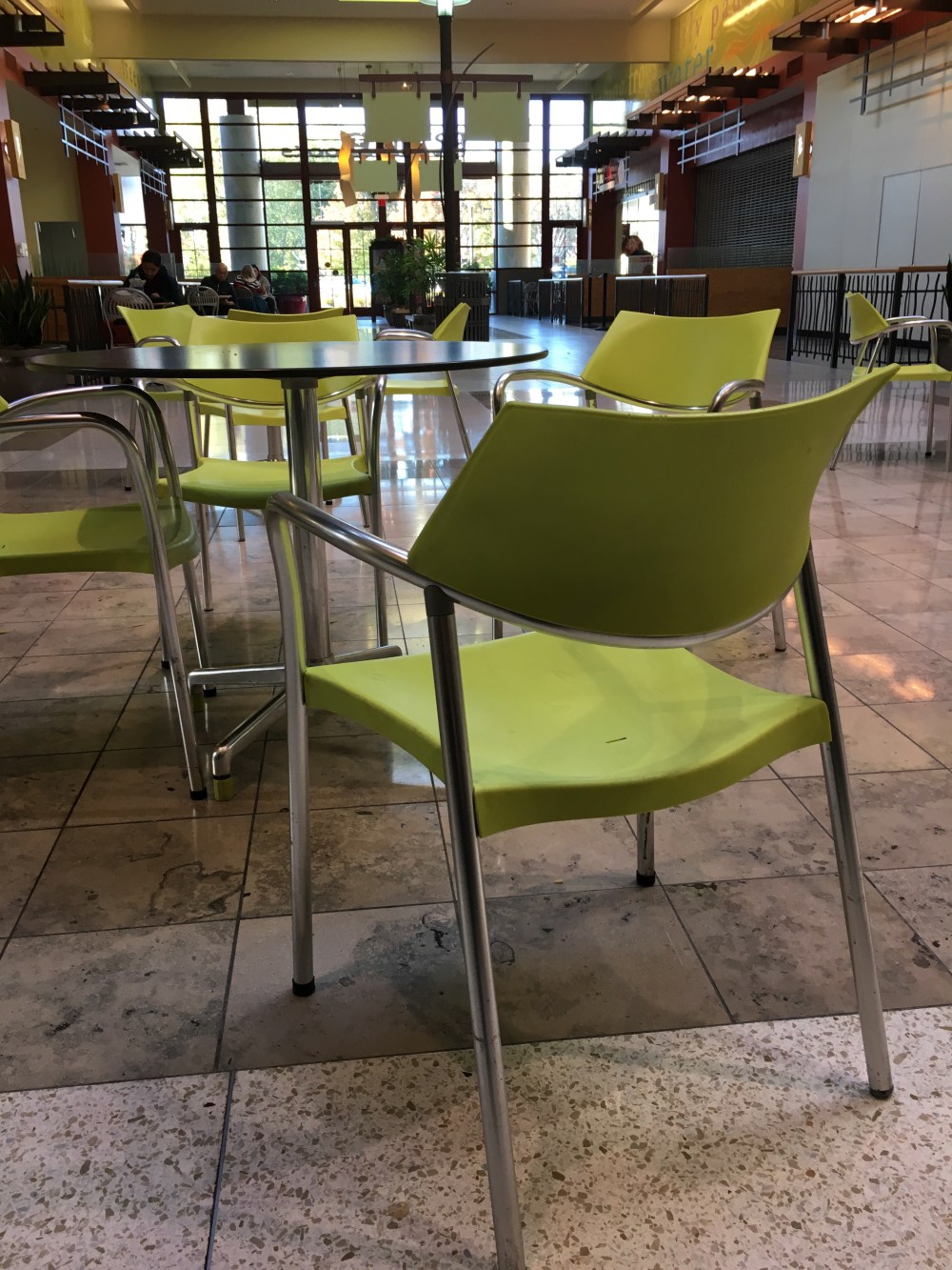 engaging them in the story, asking them questions. Before then, I had seen this woman sitting by herself at one of the tables in the mall, sitting in a lime green chair.