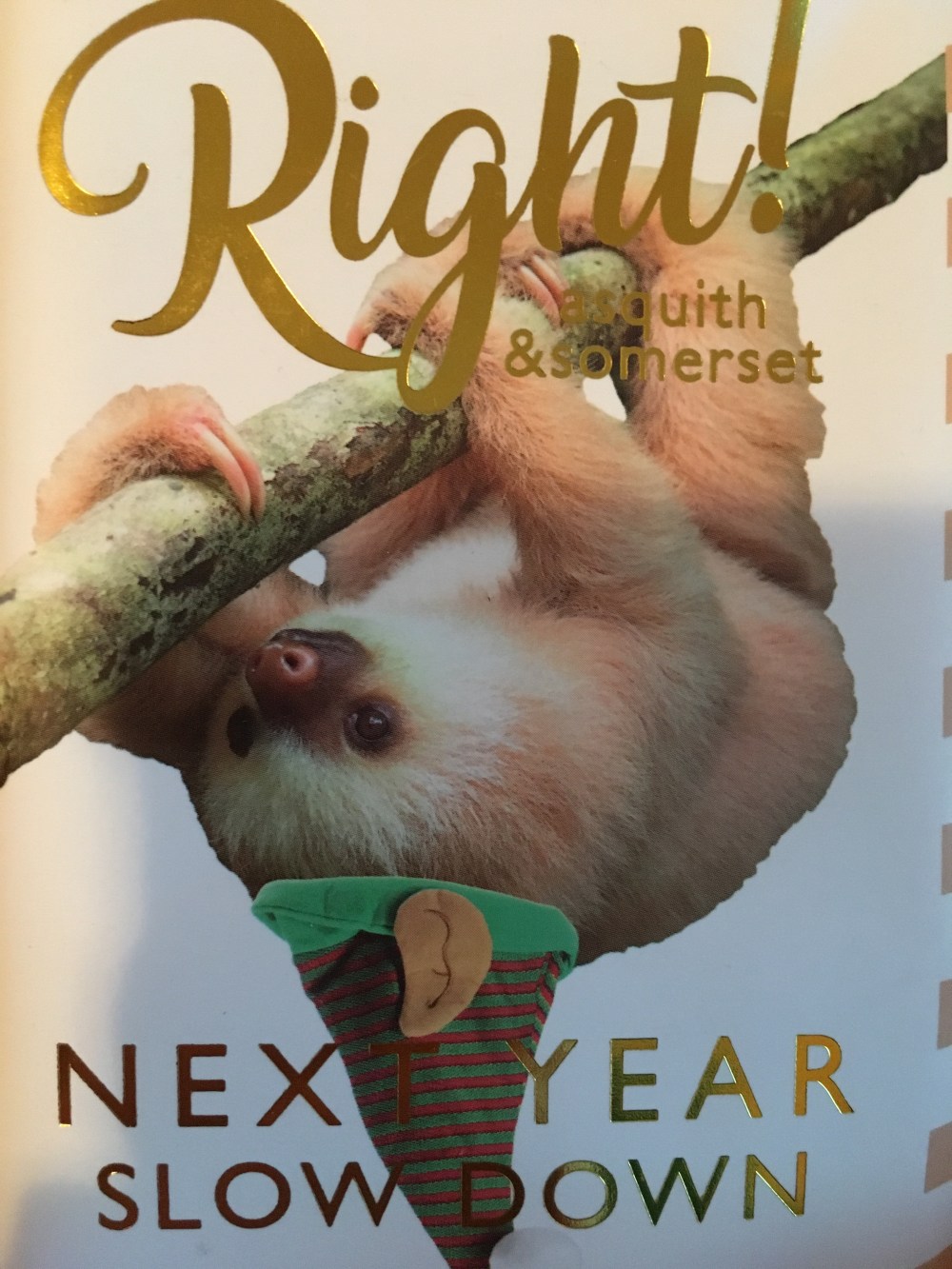 I loved the sloth and that it says: “NEXT YEAR slow down .”