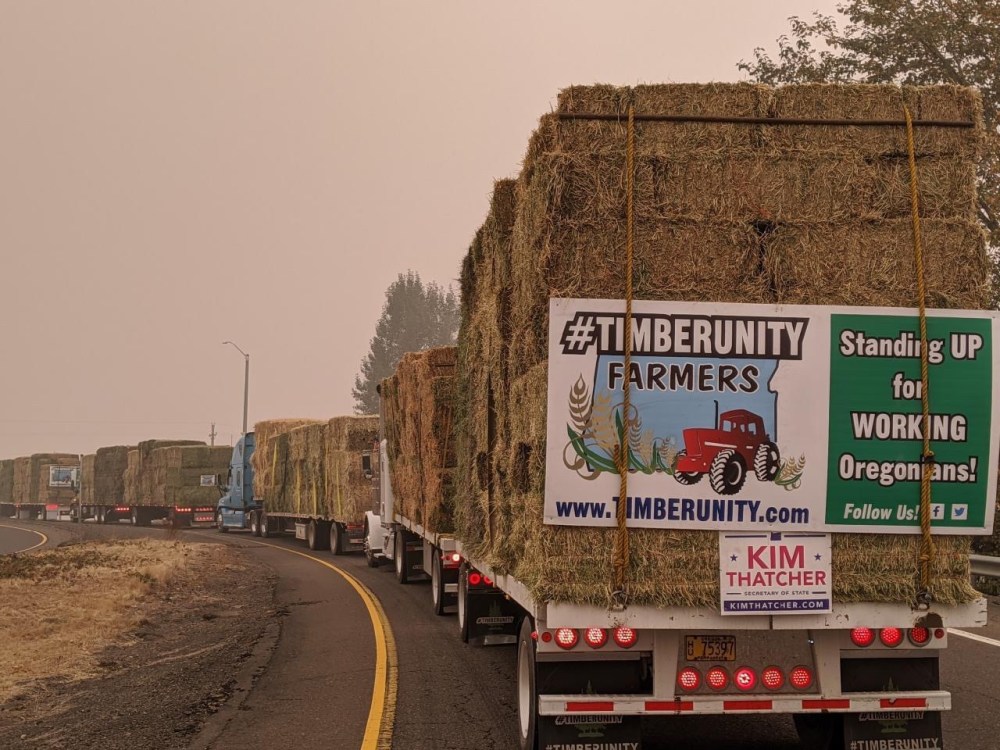 “Friday, trucks rolled up from Klamath Falls, OR to Tangent, OR laden down with hay, oats, and chicken feed. Tens of thousands of dollars worth of donated materials sent by Timber Unity Farmers to help families with displaced animals.”