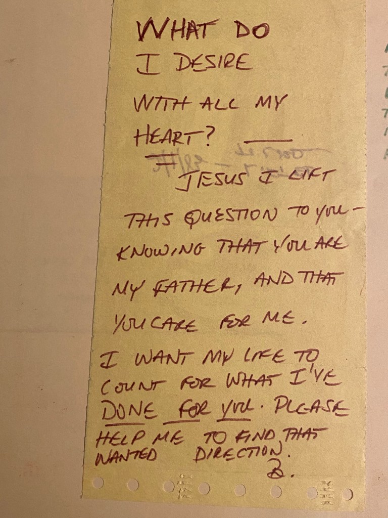 “Last night I felt like you were calling me into seminary, so that I could learn to do what Ron Walters does so well: teach. But I think in some way that was simply a way where I could access his humor and speaking talents — which are your exclusive gifts to him. Forgive me, Lord, that I always look toward the easy way out. The way that doesn’t take effort on my part, but where the RIGHT circumstances will fall upon me. So, Lord, I am not shutting out the idea of seminary, just trying to learn to shut out those ambitions which are in actuality selfish: to gain my own contrived ends…. I will follow you.”