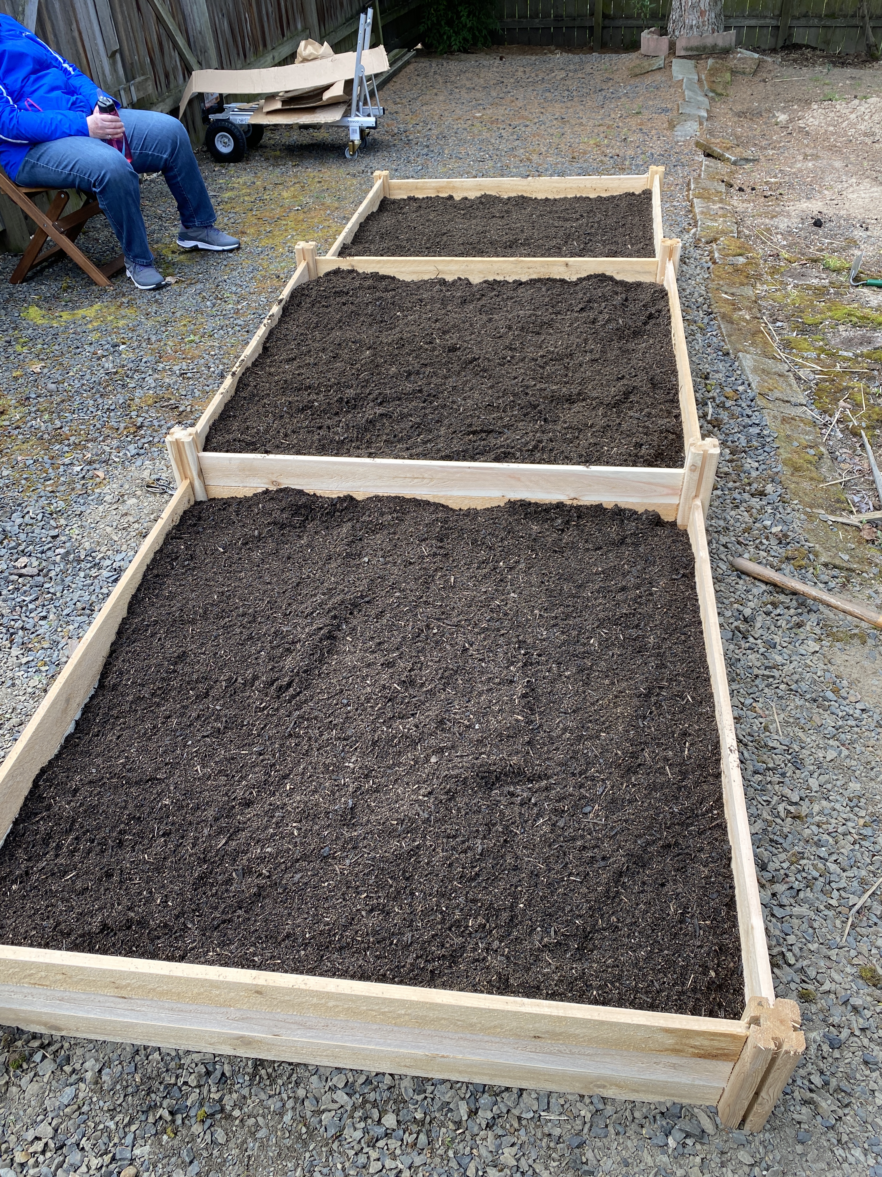 But now, I love gardens. And this year, for my birthday, I got surprised with a raised bed setup for a vegetable garden by my family. A dear friend and our youngest daughter were available to come help construct the beds. We used 22 bags of great quality soil to fill them. Currently, I am hampered in doing such outdoor work because of a torn rotator cuff in my right shoulder, so, I need the help.
