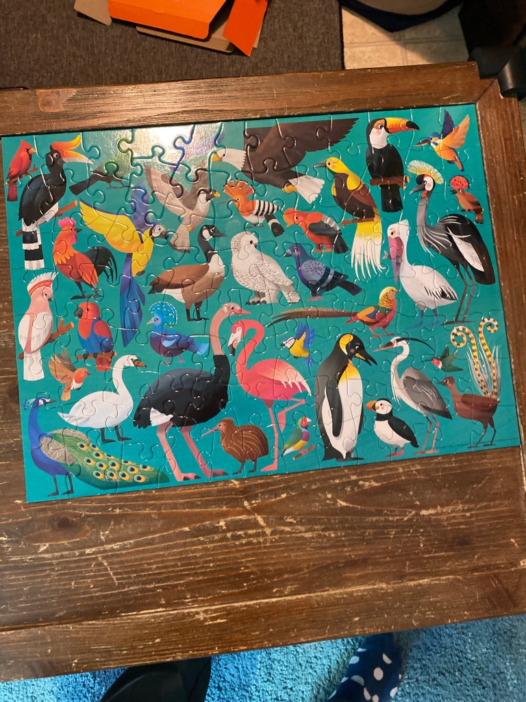 We broke out a 100-piece puzzle and I watched amazed as this little guy, separated all the edge pieces from the center ones, and formed the edge. Then began to put in the middle pieces. I put in a few pieces but he mostly built this puzzle on his own. Certainly, he had done it previously, but Matthew told me later it had been months since they had broken it out. It was a feat for someone his age.
