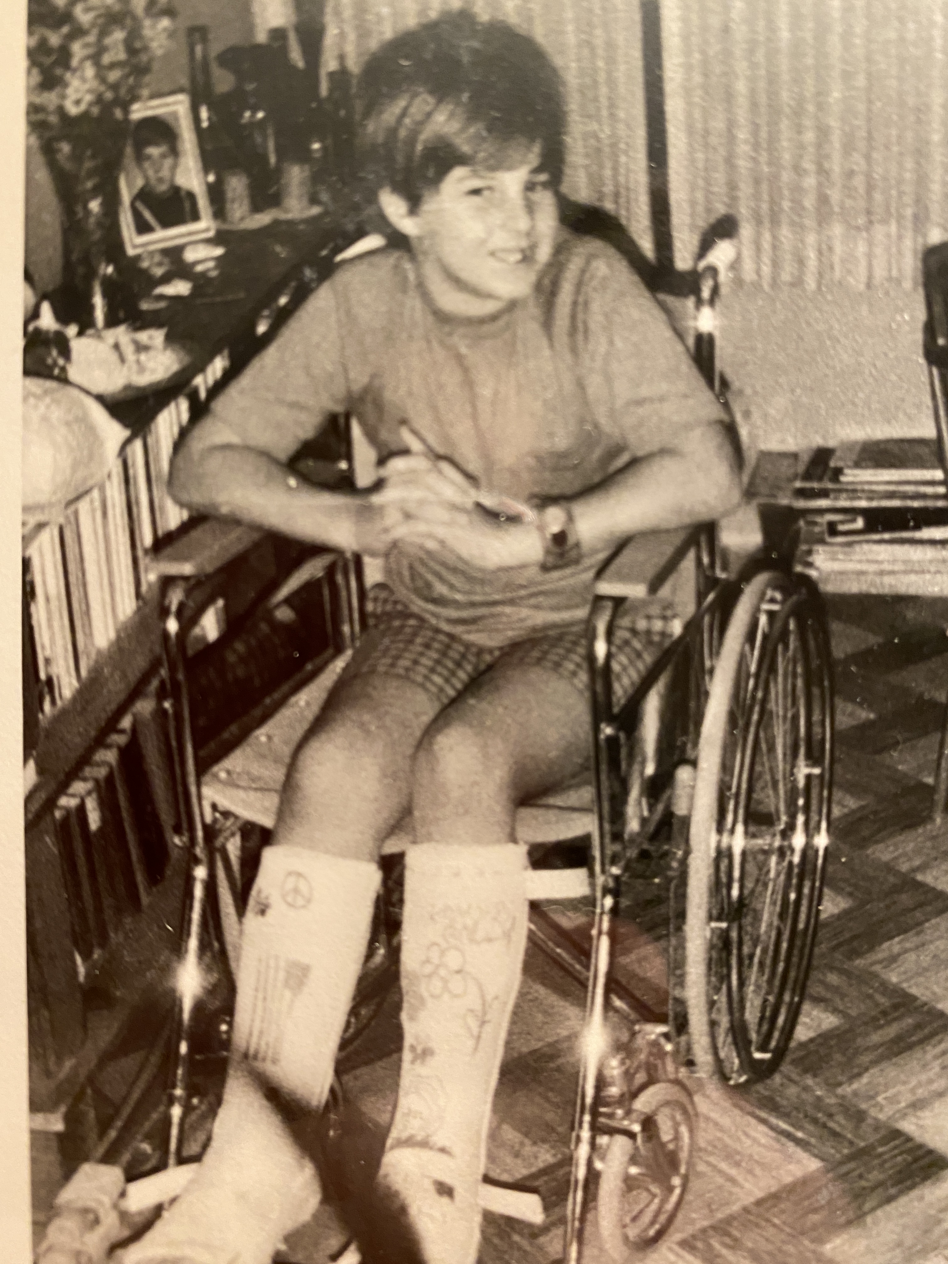 Then, I was put on crutches and finally, around Christmas, into a wheelchair. I suddenly became popular in that thing and got pushed at high speeds around the school. All this time, I hurt.