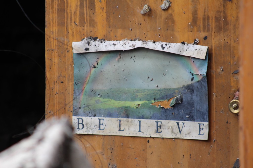 The education building was ruined by the fire. What didn’t burn was heat and smoke damaged. That was the case, except for a wooden cross (!) and one poster on the door to the Youth Room, which had faced the hottest part of the fire yet not burned. The poster still said, “Believe,” surrounded by slightly singed edges. We saved that poster, later framed it in a shadow box frame as an ongoing witness to God’s call upon us.